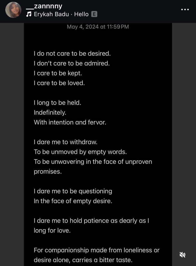If you’re going to give me anything, give me love. Give me curiosity. Give me intentionality. Show me that you see me as a human being, who is being. Show me that you see the complexities of personhood that I am and have been. Show me that the same way that I dissect, question, and observe you, that you’re capable of returning that same focus back to me.