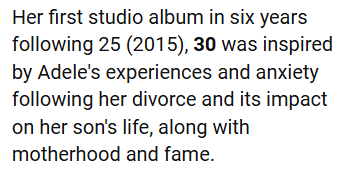I think my favorite album of all time is Adele’s divorce album, 30.