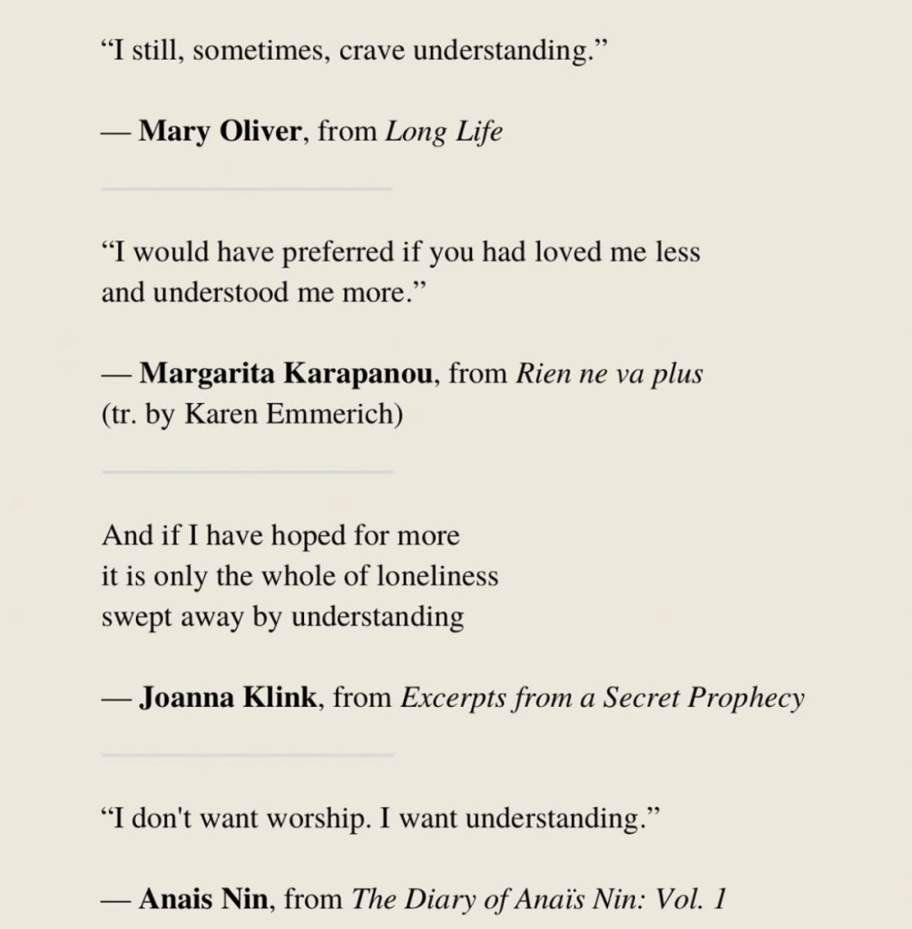 As I think about what I need, instead of desire, which burns bright at the very beginning, I need understanding. The thing that helps me to be centered in all other relationships.